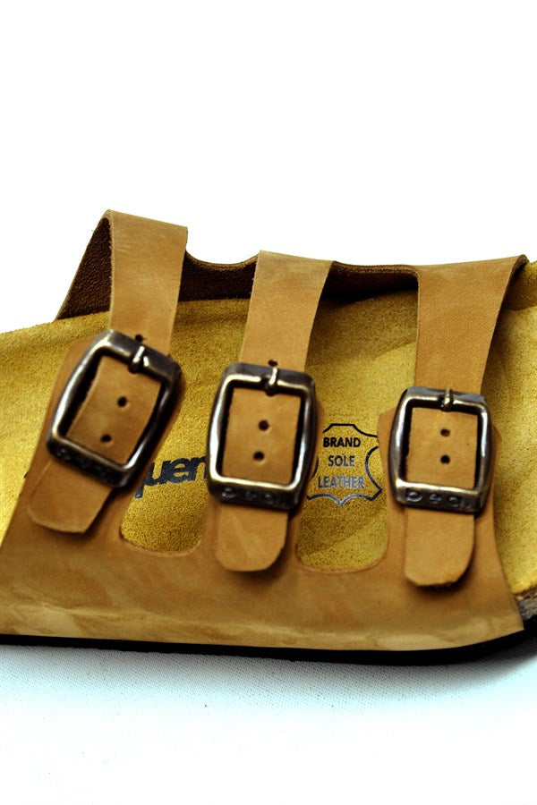 Unisex Anatomical Natural Footbed Multi-Band Sand Beige Leather Slippers