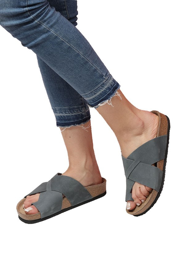 Women's Anatomical Natural Footbed Navy Blue Leather Slippers